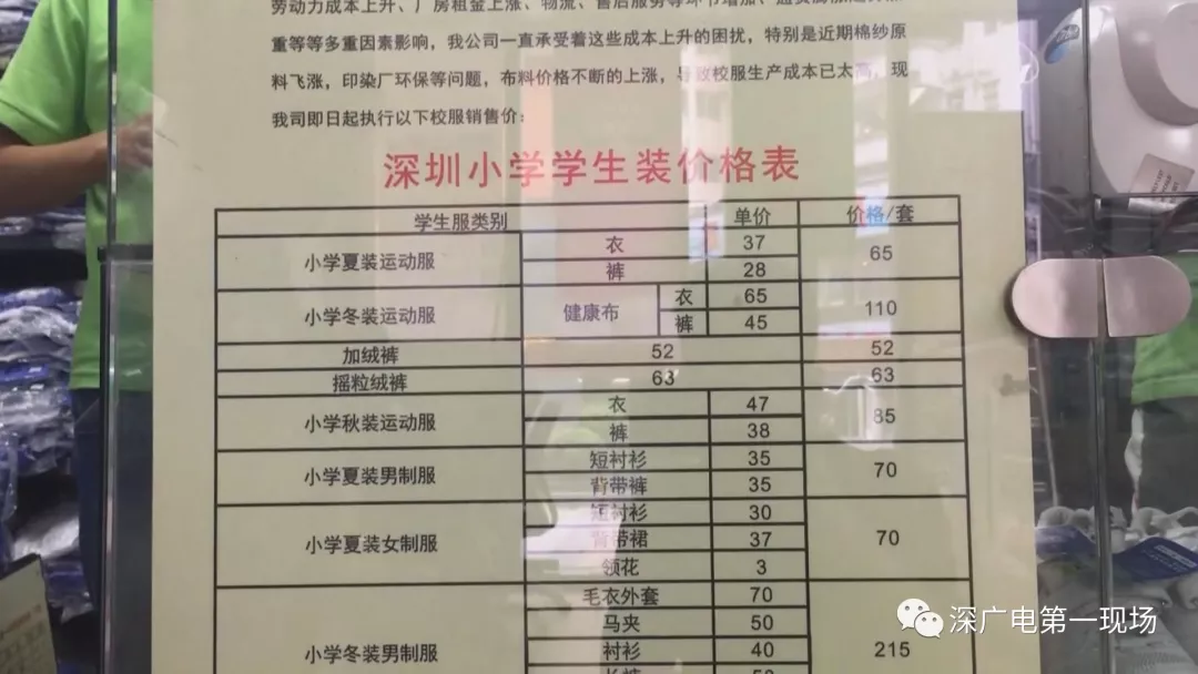 記者了解到,2011年,深圳校服曾進(jìn)行過調(diào)價,當(dāng)時教育部門發(fā)布通告稱,由于廠家成本上升,校服價格統(tǒng)一調(diào)整,平均價格比之前高出14.02%。之后,這一價格標(biāo)準(zhǔn)一直沿用。