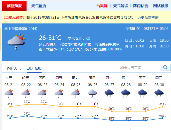 據(jù)深圳氣象臺預(yù)計,21日~22日,深圳多云,局地易出現(xiàn)雷陣雨,風力持續(xù)微弱,部分時間還有輕霧或霾,能見度較差。其中,21日早晚濕度大,有輕霧,中午以后濕度有所下降,大部分地區(qū)輕霧會轉(zhuǎn)成輕度灰霾。