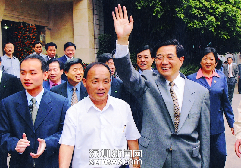 2003年4月12日,胡錦濤同志(前排右一)視察南嶺村,老書記張偉基(右二)陪同,張育彪也是陪同人員(左一)