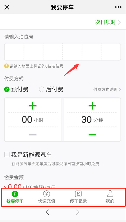 按箭頭填上泊位號(hào),填好預(yù)付費(fèi)或后付費(fèi),選擇預(yù)停時(shí)間,點(diǎn)擊確定即可。