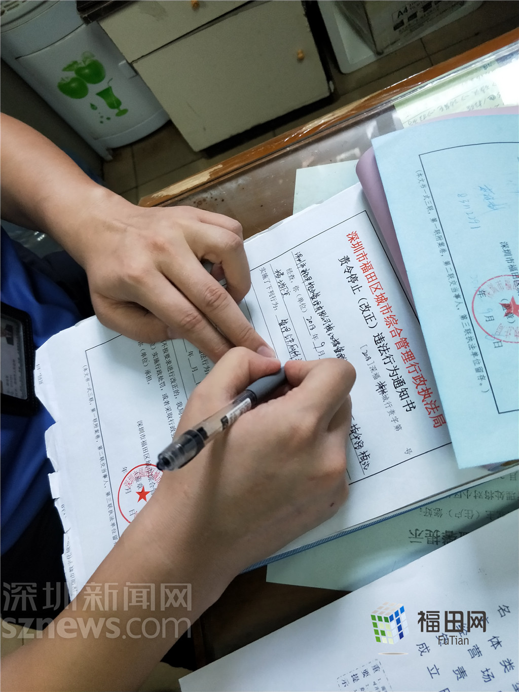 福田街道執(zhí)法隊給購物公園管理處開具責令停止(改正)違法行為通知書。