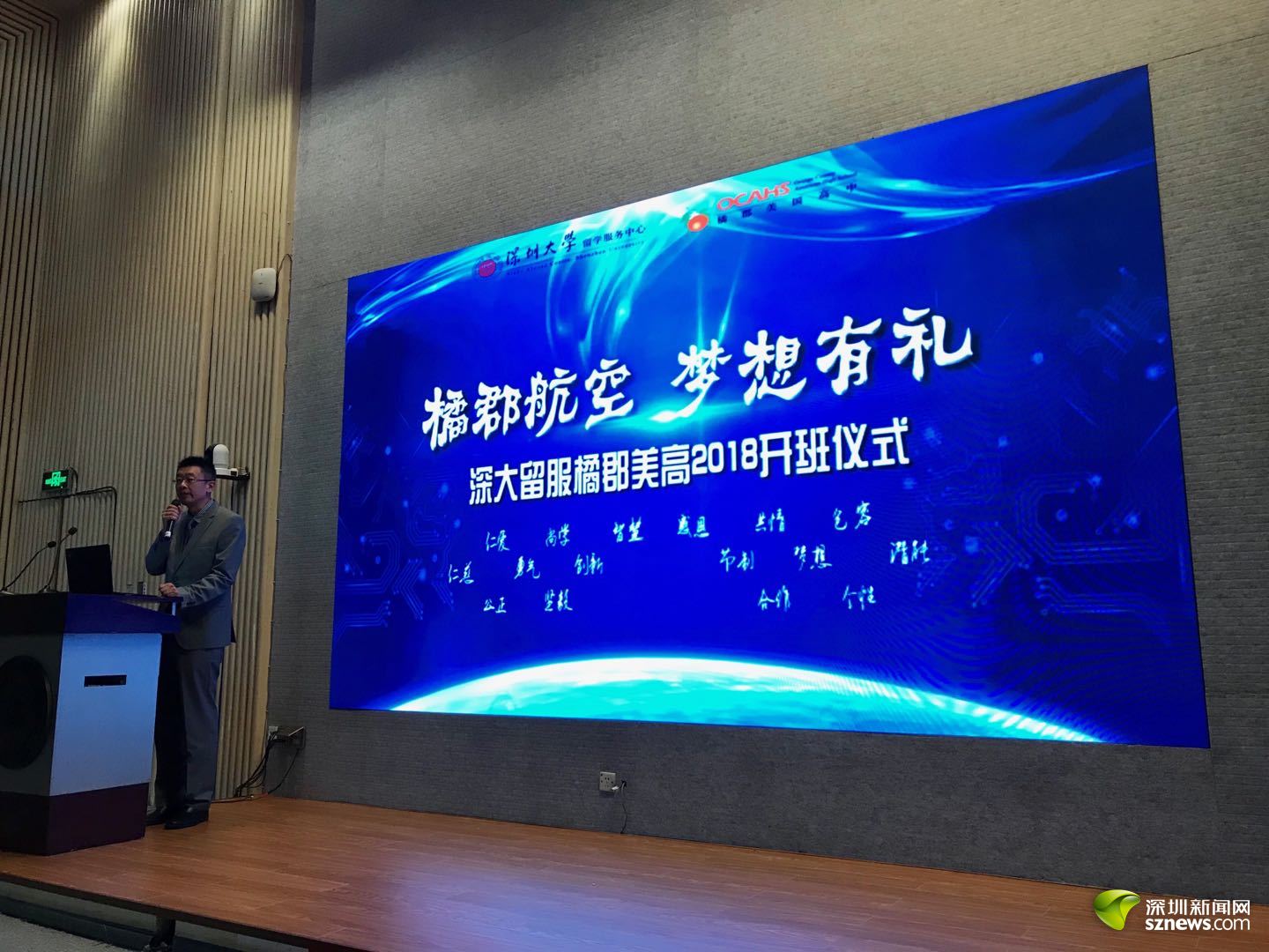 深圳大學(xué)國際交流學(xué)院院長董國民、深圳大學(xué)留學(xué)服務(wù)中心主任曾颯、嘉道方直教育產(chǎn)業(yè)投資基金總經(jīng)理蕭旭、橘郡美高中國區(qū)總校校長左陽博士、深大留服橘郡美高教學(xué)校長林偉健等領(lǐng)導(dǎo)、嘉賓,2018級全體師生及家長等出席了開班儀式。