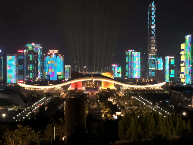 這臺(tái)別開(kāi)生面的晚會(huì),主舞臺(tái)設(shè)在市民中心廣場(chǎng),舞臺(tái)后方呈現(xiàn)著深圳市精心打造的福田中心區(qū)43座樓宇燈光秀,五彩斑斕、綺麗多姿的深圳城市新夜景,與晚會(huì)現(xiàn)場(chǎng)舞臺(tái)融為一體,為市民和廣大觀眾呈現(xiàn)出一個(gè)迷人的“深圳之夜”。