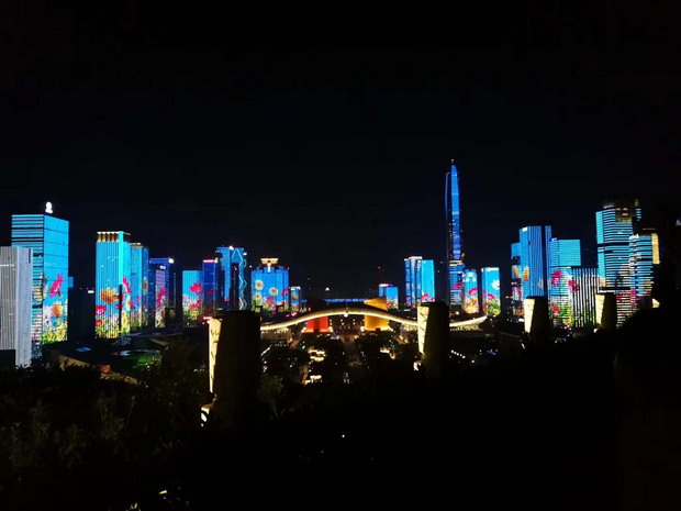 這臺別開生面的晚會,主舞臺設在市民中心廣場,舞臺后方呈現(xiàn)著深圳市精心打造的福田中心區(qū)43座樓宇燈光秀,五彩斑斕、綺麗多姿的深圳城市新夜景,與晚會現(xiàn)場舞臺融為一體,為市民和廣大觀眾呈現(xiàn)出一個迷人的“深圳之夜”。