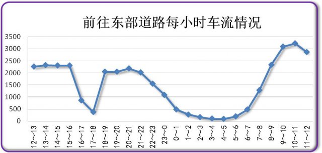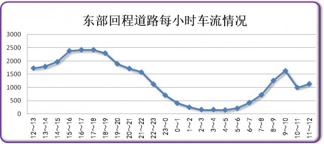 今日上午8時(shí)開(kāi)始,東部回程的車(chē)輛增多,9時(shí)達(dá)到峰值,約1629輛。