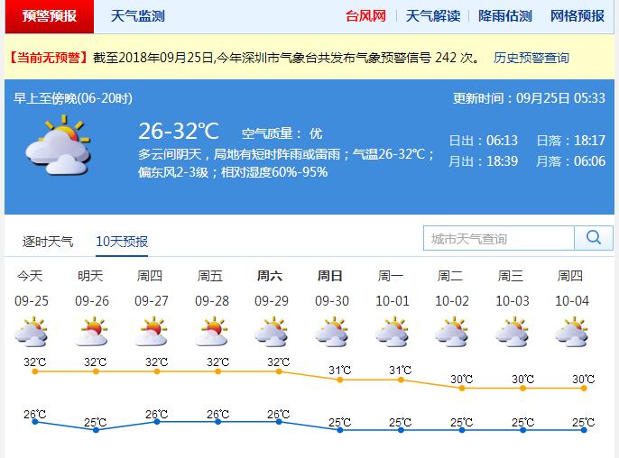 市氣象臺預(yù)測,26日,受偏東氣流影響,多云間陰天,有短時(shí)雷陣雨,氣溫為25-32℃。27日起,轉(zhuǎn)東北風(fēng)影響,天氣晴朗,最高氣溫32-33℃。預(yù)計(jì)超強(qiáng)臺風(fēng)“潭美”將趨向呂宋島以東洋面,未來幾天對深圳無風(fēng)雨影響。(記者李秀瑜)
