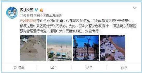 今日(9月25日)深圳市交警局宣布,由于臺風"山竹"對東部景區(qū)破壞嚴重,目前部分景區(qū)仍在搶修中。交警蜀黍經過綜合考慮,決定取消國慶期間前往東部的預約措施。