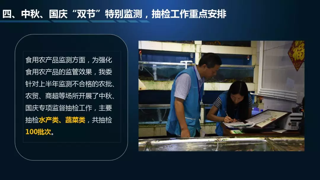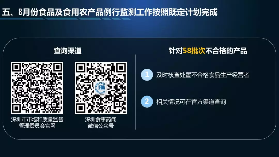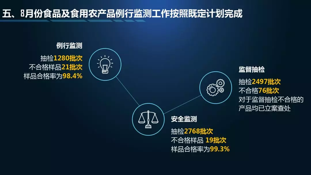 第二個“3”是三項檢測結果通報,分別是中秋、國慶的特別監(jiān)測通報,8月份食品例行監(jiān)測通報,8月份食用農產品例行監(jiān)測通報;