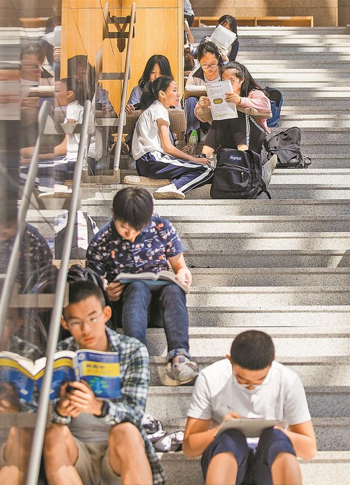 國(guó)慶長(zhǎng)假期間,去圖書館“充電”成為不少深圳人的度假方式。由于深圳圖書館座位已滿,不少市民直接坐在階梯上閱讀學(xué)習(xí)。 深圳特區(qū)報(bào)記者 劉羽潔 攝