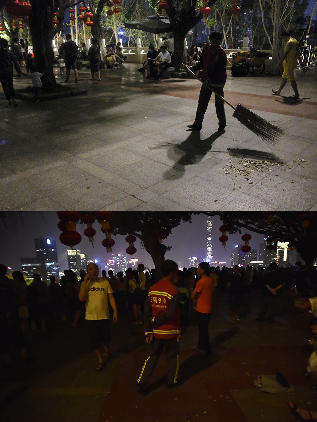 鄧小平雕塑右側(cè),燈光秀結(jié)束后垃圾迅速被責(zé)任環(huán)衛(wèi)工人清掃