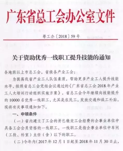 為提高我省產(chǎn)業(yè)工人隊伍素質(zhì),幫助更多產(chǎn)業(yè)工人提升技能水平,按照省總工會黨組會議通過的《廣東省總工會2018年產(chǎn)業(yè)工人大培訓行動組織實施方案》,省總工會繼續(xù)向10000名技能提升的優(yōu)秀產(chǎn)業(yè)工人發(fā)放交通和誤工補貼。取得職業(yè)資格證書可獲300~500元補貼,名額有限,先到先得!