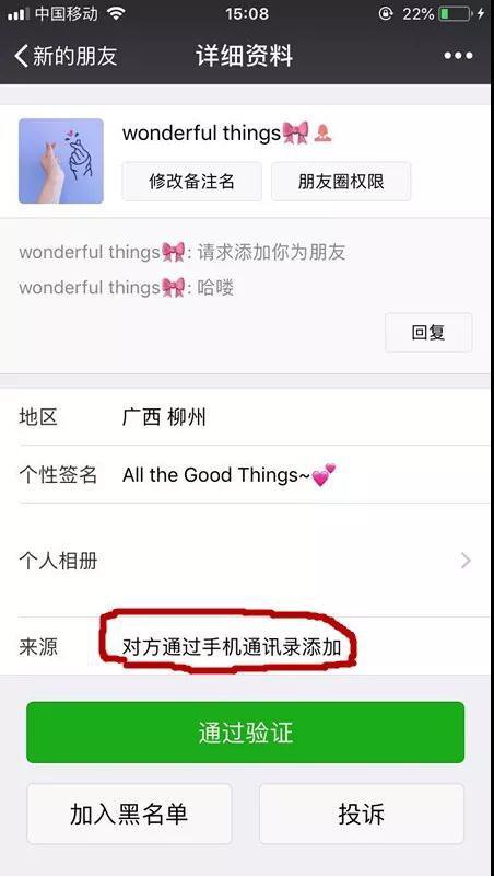 或者 " 通過手機(jī)通訊錄 " 添加的申請,實(shí)際上是騙子使用一種軟件,把經(jīng)地下渠道收集到的眾多手機(jī)號碼自動存入自己的手機(jī)通訊錄,然后由微信自動匹配發(fā)出好友申請,迷惑性極強(qiáng)。
