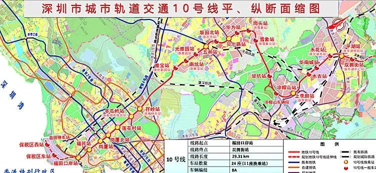 地鐵10號(hào)線全長(zhǎng)29.2千米,起自福田區(qū)福田口岸站,終至龍崗區(qū)平湖中心站,南北向貫穿深圳市區(qū),全部采用地下敷設(shè)方式。