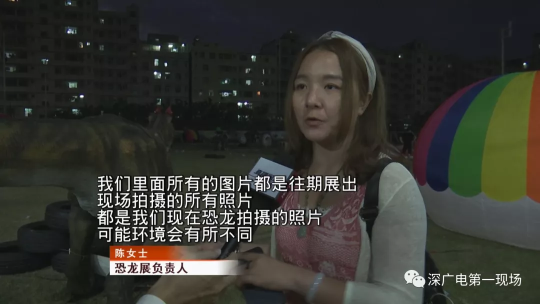 恐龍展負(fù)責(zé)人陳小姐說(shuō):“我們里面所有的圖片都是往期展出,可能環(huán)境會(huì)有所不同,因?yàn)橐郧拔覀冇性谏鷳B(tài)園公園、景區(qū)里面辦,是有一些樹(shù)木為背景的,因?yàn)槲覀冞@里只有一大片草地,可能看起來(lái)的話,造景不太美觀。”