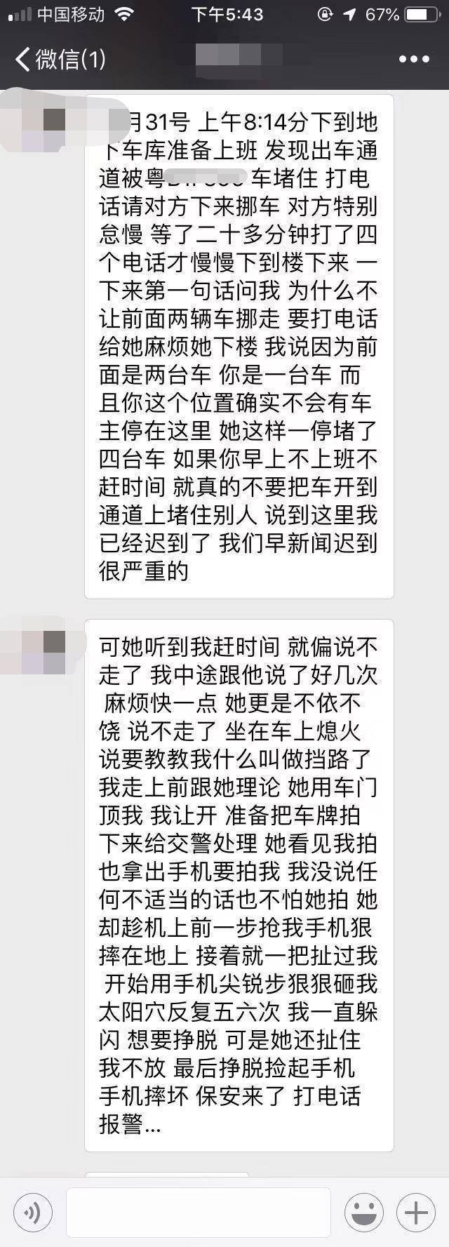 李小姐說,當(dāng)天早上8點(diǎn)14分,她下到車庫準(zhǔn)備開車上班,發(fā)現(xiàn)出車通道被一輛黑色小車阻擋。她便打電話請(qǐng)車主下樓挪車。她表示,自己在電視臺(tái)工作,因著急趕著錄制早新聞,打了四個(gè)電話給對(duì)方車主,等待了近20分鐘,車主才下到車庫。