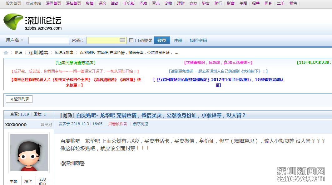 深圳新聞網(wǎng)11月5日訊(記者 何暢)“百度貼吧龍華吧上面充滿色情、微信買賣,公然收身份證,小額貸等,沒人管?”,近日網(wǎng)友在深圳論壇上曝料百度貼吧“龍華吧”內(nèi)存在大量違法違規(guī)信息,引起網(wǎng)友廣泛關(guān)注。(網(wǎng)帖地址:https://szbbs.sznews.com/thread-3812582-1-1.html