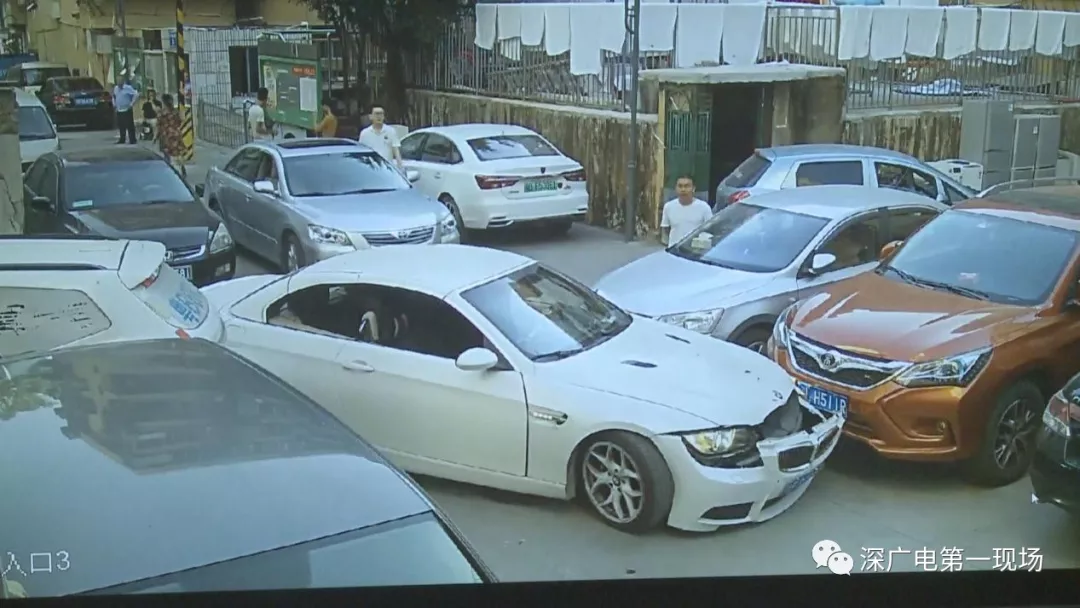 從監(jiān)控畫面中可以看到,粵E牌白色寶馬小車,在原本就擁擠的停車路段內,不停地前進倒退,走著奇怪的路線,在倒車時他接連將停放路旁的車輛撞了個遍,隨后便卡在了路中。