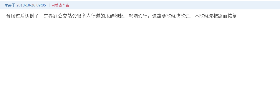 “再補一張,到2019年啦?!痹摼W(wǎng)友在發(fā)帖后的幾小時內(nèi),又補發(fā)了一張寫有“2019年實施,2019年完工”的截圖。并配圖表示“臺風(fēng)過去快2個月了,東湖路的人行道石磚仍大片凸起,地鐵站前面的道路凹凸不平,從來沒有人來處理?!?/p>