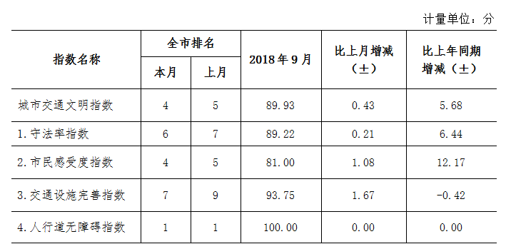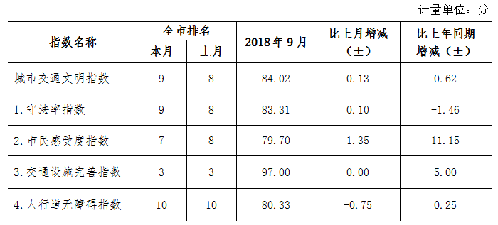 9月份深圳市城市交通文明指數(shù)為87.02分。與上月對(duì)比,四項(xiàng)分項(xiàng)指數(shù)呈“三升一降”現(xiàn)象。