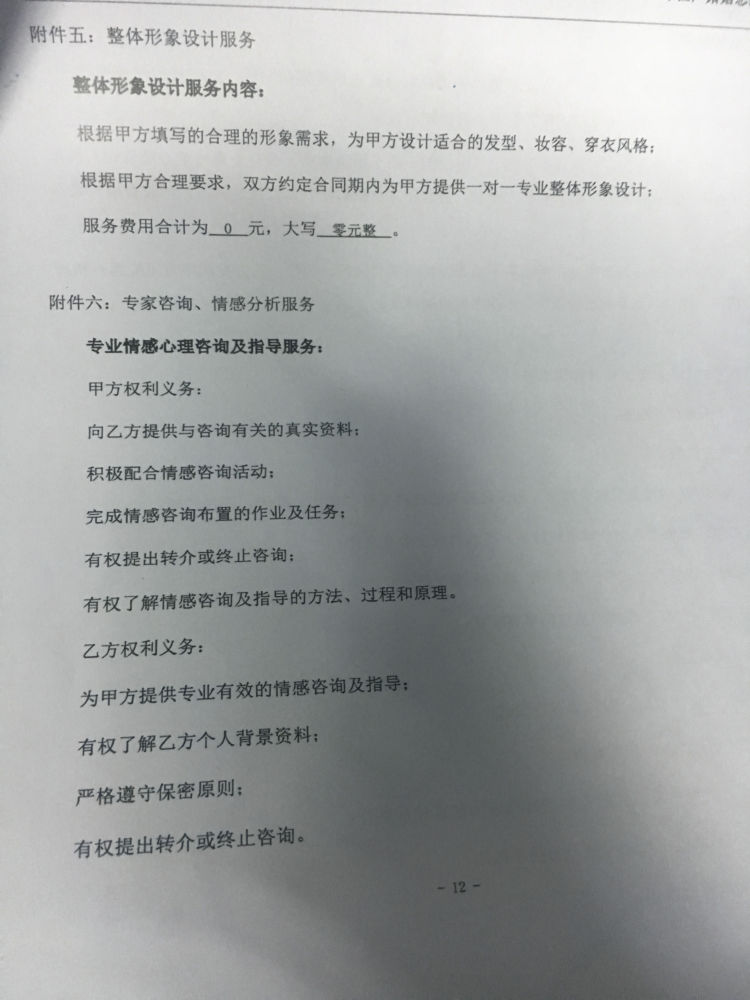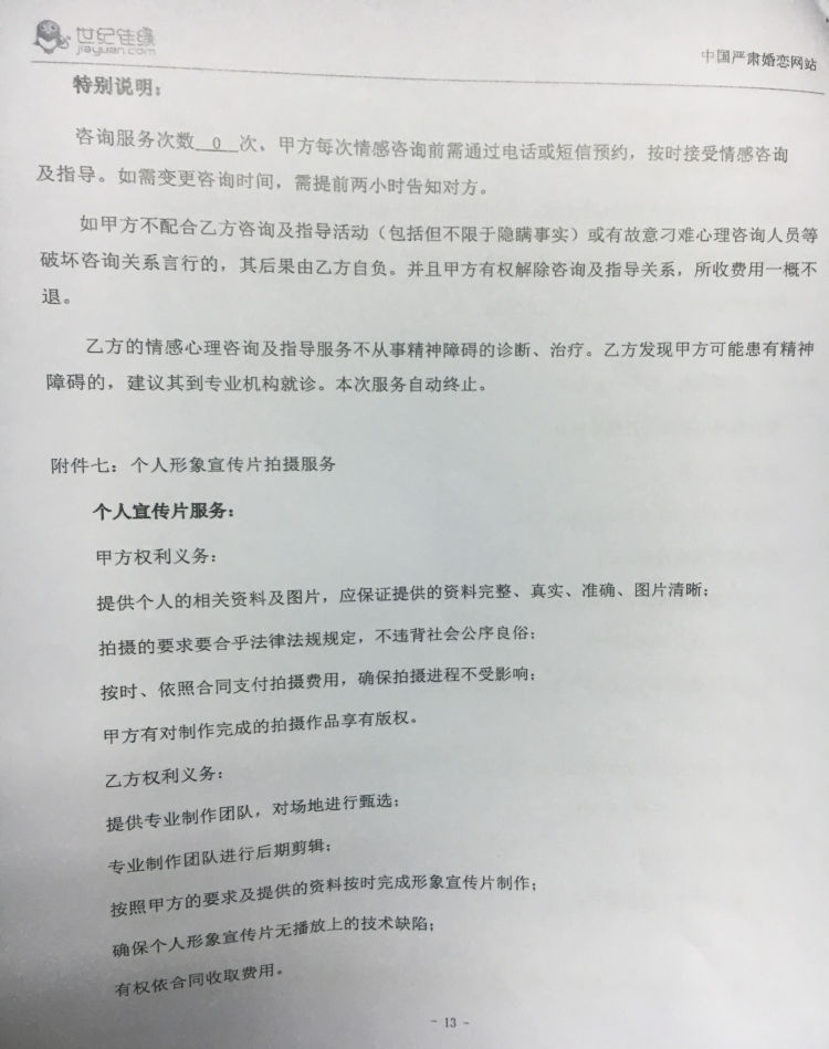 根據合同,目前服務時間已經終止,但還有心理咨詢服務及個人宣傳片兩項增值服務未履行。朱女士對此解釋,這是屬于不收費的增值服務,需要客戶自己提出才會進行?!皼]有人跟我說過這個需要自己提出要求。”劉小姐對該說法并不買賬。