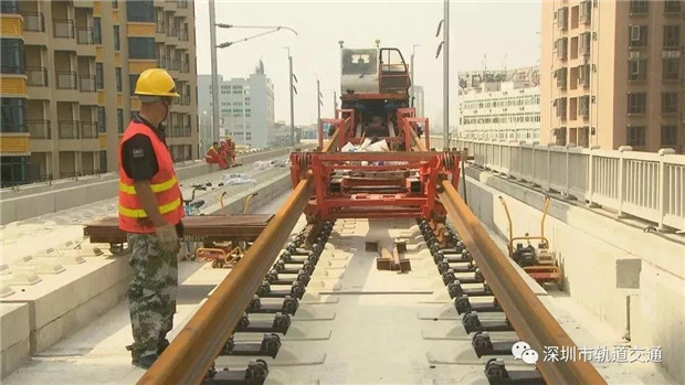 鋪軌機把長軌放入無碴道床就位