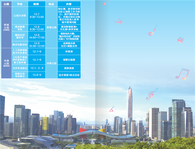 2018深圳公園文化季將延續(xù)往屆經(jīng)典品牌節(jié)目,滿足不同受眾的多元需求,推出兒童音樂劇、世界極限運(yùn)動(dòng)表演、燃動(dòng)鵬城2018福田文創(chuàng)音樂周、全國航空模型公開賽、戲曲專場等活動(dòng)。同時(shí)結(jié)合各公園特點(diǎn),打造中心公園風(fēng)箏表演、翠竹公園首屆竹文化音樂會(huì)、皇崗公園非遺主題展、梅林公園社區(qū)展演、筆架山公園“深港穗”草地滾球賽等公園特色文化活動(dòng)。