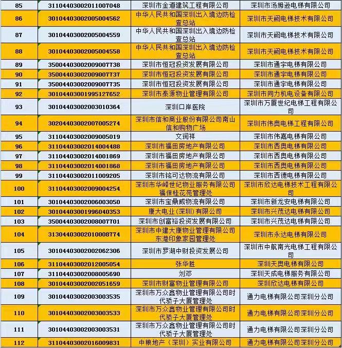 不合格電梯維保單位為:1、深圳市誠禾機(jī)電設(shè)備有限公司;2、深圳市通宇電梯有限公司;3、深圳市安眾電梯工程有限公司;4、深圳市蓉奧電梯有限公司;5、清遠(yuǎn)市中日富士電梯有限公司;6、富士通(深圳)有限公司。