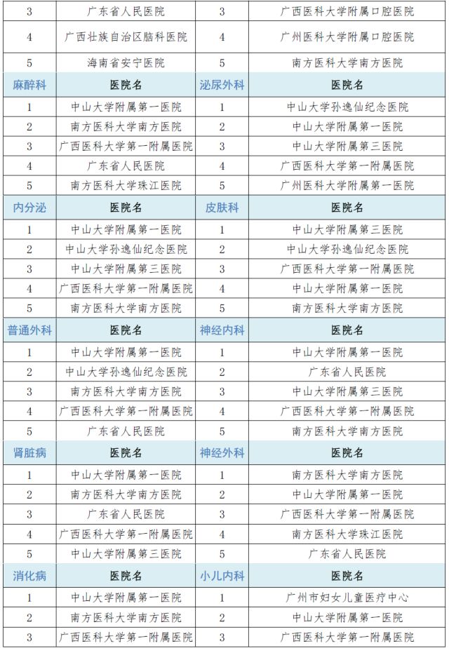 此外,廣東進(jìn)入全國(guó)專(zhuān)科前十名的其他專(zhuān)科有:中山三院的風(fēng)濕科;廣州市精神衛(wèi)生中心(廣州惠愛(ài)醫(yī)院)的精神醫(yī)學(xué);中山大學(xué)光華口腔醫(yī)院的口腔科;中山大學(xué)孫逸仙紀(jì)念醫(yī)院的泌尿外科、內(nèi)分泌科;廣州市婦兒中心的小兒外科;廣州醫(yī)科大學(xué)附屬第一醫(yī)院的胸外科;中山大學(xué)附屬腫瘤醫(yī)院的胸外科與腫瘤學(xué)。