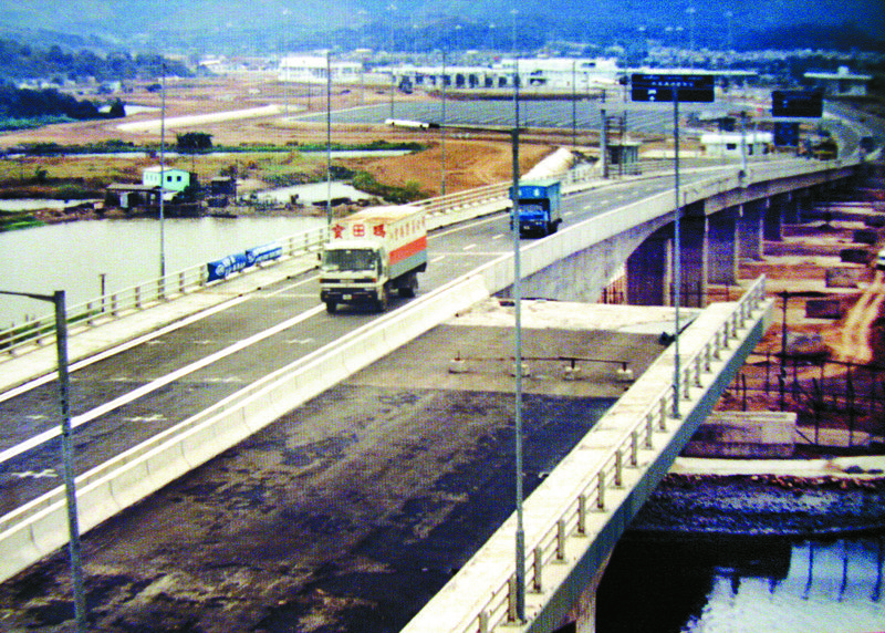 1989年12月26日,皇崗口岸開通時的第一輛入境貨柜車,當時落馬洲大橋只建成一半。 黃國春 攝