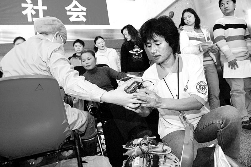 2006年,深圳獻(xiàn)血女狀元高敏在捐血現(xiàn)場(chǎng)協(xié)助醫(yī)生工作。 記者 許業(yè)周 攝