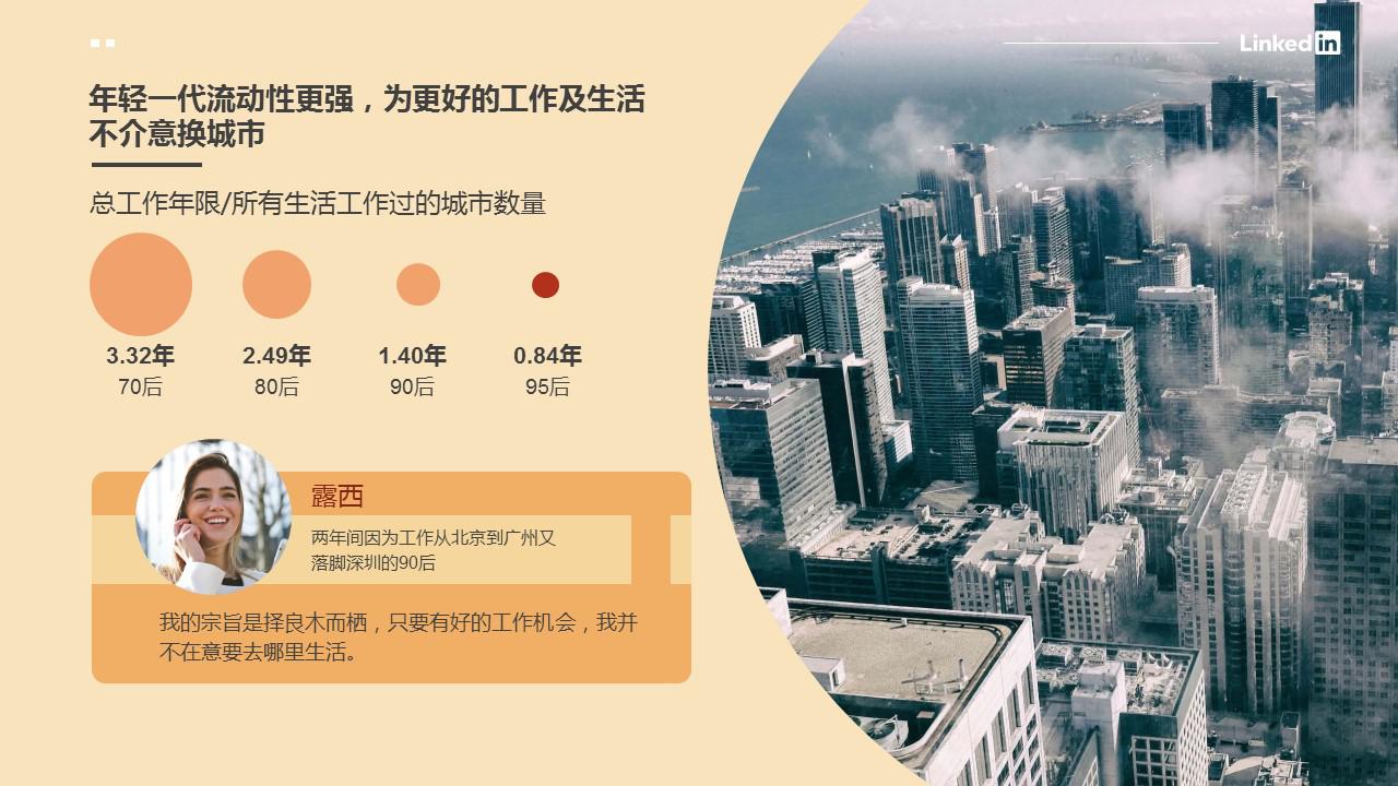 不論是因?yàn)楦玫墓ぷ鳈C(jī)會(huì)還是更理想的生活方式,新一代90/95后職場(chǎng)人都表現(xiàn)得更加勇敢和有魄力,“不將就”或許是他們最好的代名詞。畢業(yè)兩年間已經(jīng)經(jīng)歷從北京跳到廣州、又最終落腳深圳的90后露西表示:“不論是工作還是生活的城市,我都不會(huì)給自己太多限制,根本的原則就是擇良木而棲?,F(xiàn)在許多城市對(duì)年輕人有很多利好政策,工作機(jī)會(huì)也很多,我也想多嘗試一些不同的選擇,年輕的時(shí)候就應(yīng)該多嘗試。”