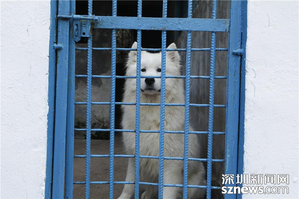 一只薩摩耶在犬舍安靜的坐著