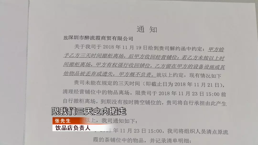 記者在飲品店墻上看到了一則通知,優(yōu)米道商場(chǎng)以飲品店拖欠租金為由與其解約,限飲品店在11月23日15點(diǎn)前自行離場(chǎng),到期不按時(shí)騰空鋪位,飲品店將要承擔(dān)由此產(chǎn)生的一切損失和后果。