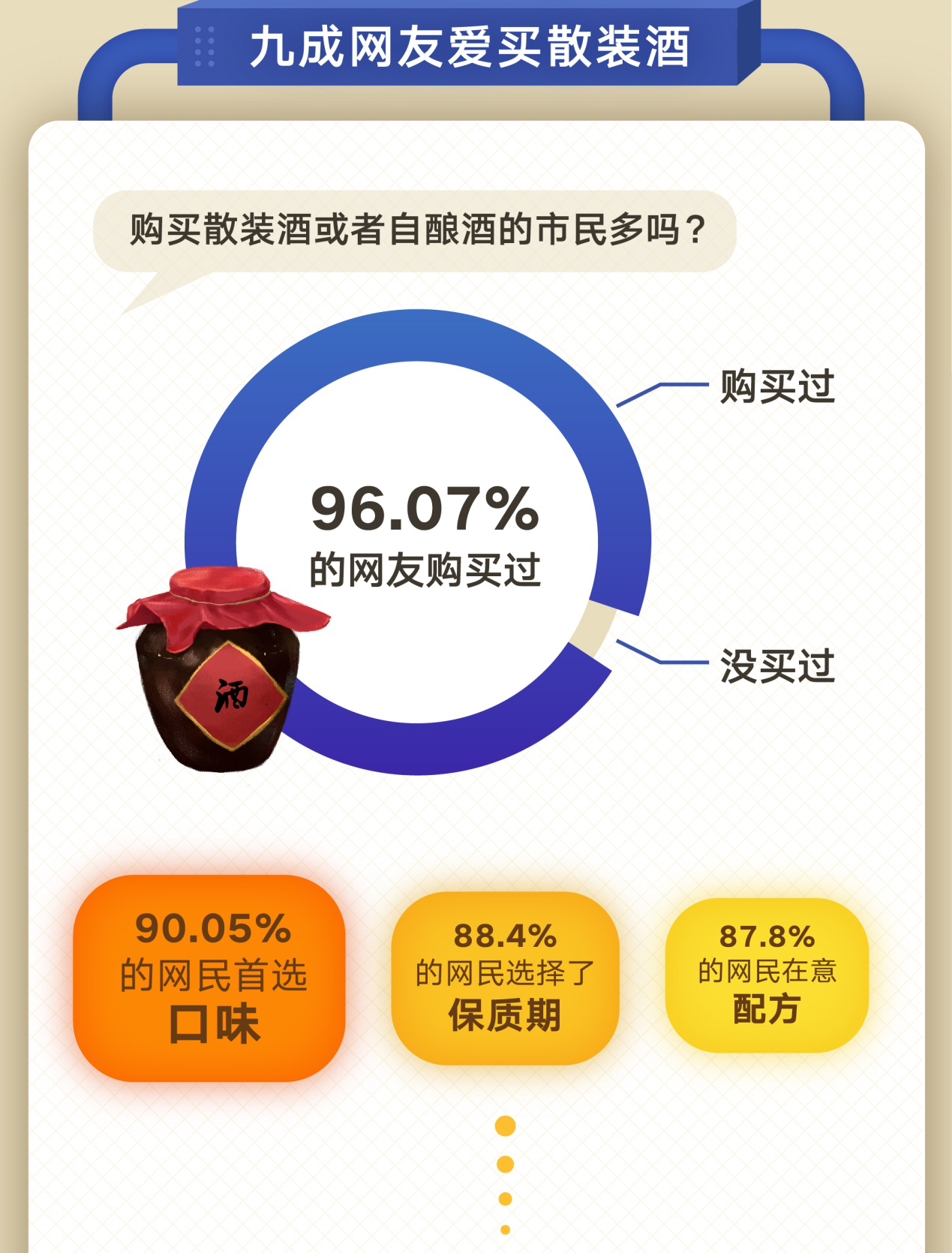 在深圳,購買散裝酒或者自釀酒的市民多嗎?根據此次調查數(shù)據顯示,高達96.07%的網友都曾購買過,可見散裝酒和自釀酒的受歡迎程度。 買散裝酒最看重什么?調查數(shù)據顯示,90.05%的網民首選口味;88.4%的網民選擇了保質期;87.8%的網民在意配方,而對安全性關注的只有7.95%。