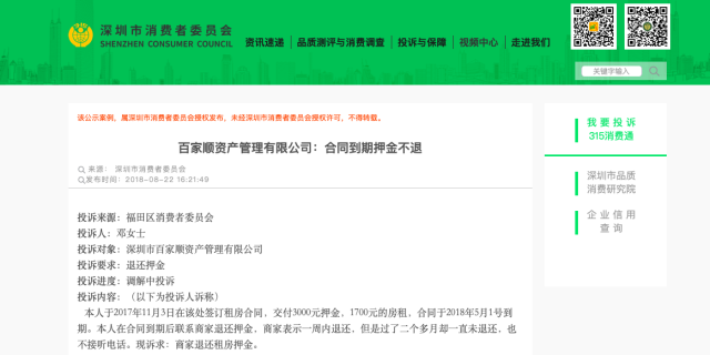 深圳市消委會(huì)官網(wǎng)通報(bào)對(duì)余綿亮公司的投訴