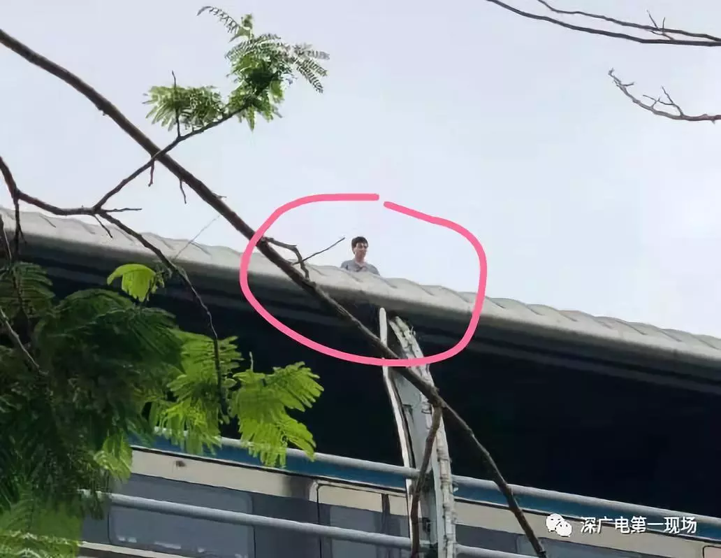 從乘客拍攝的視頻可以看到,這名男子闖入軌行區(qū)后,一開始爬到了外側(cè)的護欄上,但過了一會,他就順著護欄爬上了車站的頂棚。
