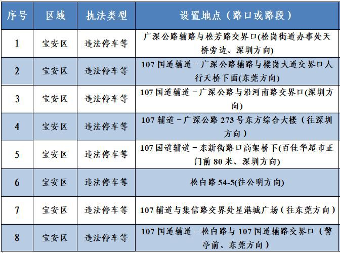 深圳新聞網(wǎng)12月10日訊(記者 何暢)據(jù)“深圳交警”微信公眾號消息,深圳56套“電子警察”新上線,其中46套專門查處違法停車,4套用于查處泥頭車違反禁行限行規(guī)定,6套用于查處沖紅燈、逆行、進(jìn)入導(dǎo)向車道變更車道等違法行為。56套“電子警察”具體分布位置如下: