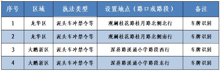 4套車牌識別監(jiān)控設(shè)備可用于查處泥頭車違反禁行限行規(guī)定等交通違法行為。位于龍華區(qū)的觀瀾桂花路桂月路和大鵬新區(qū)的深葵溪涌小學(xué)路段。