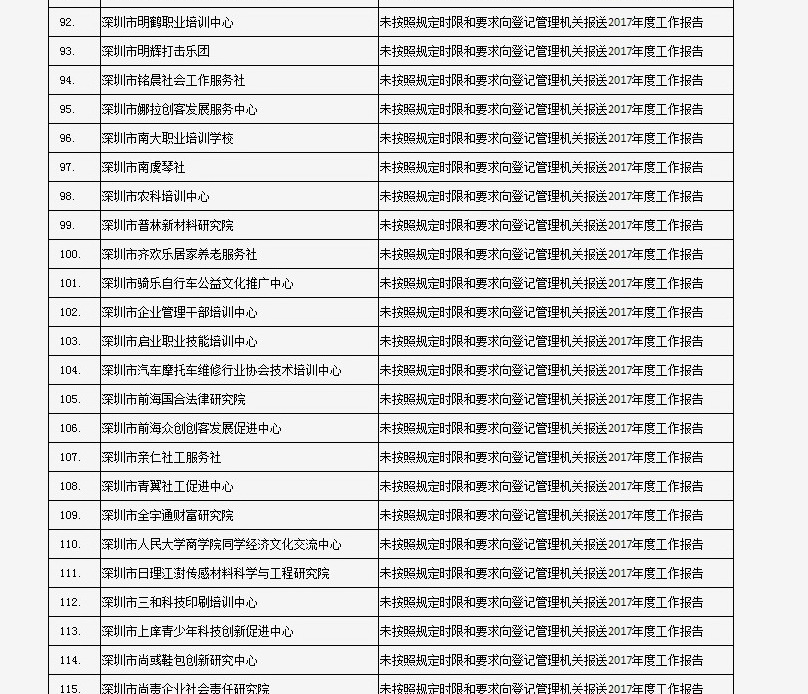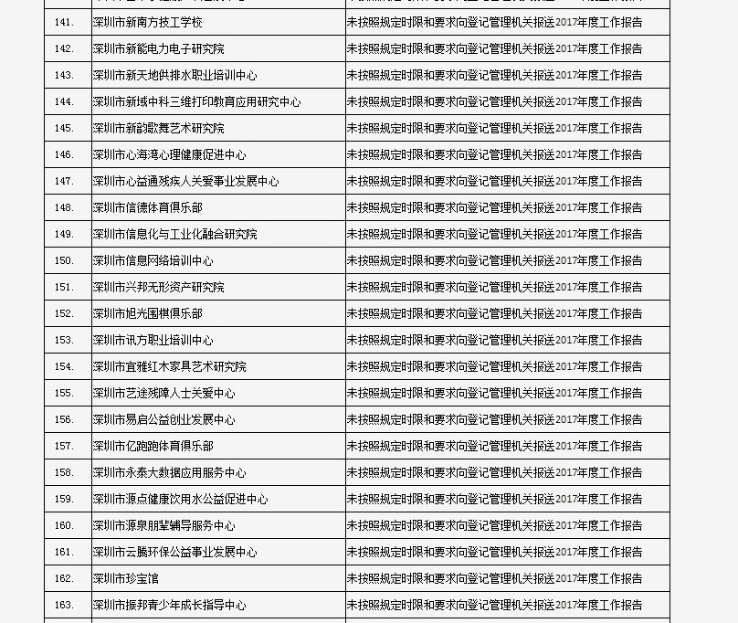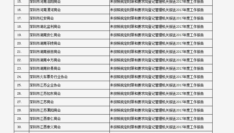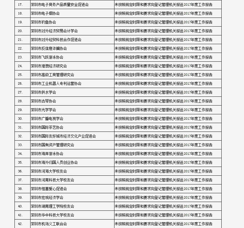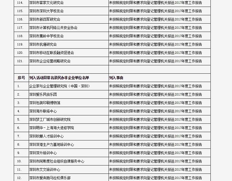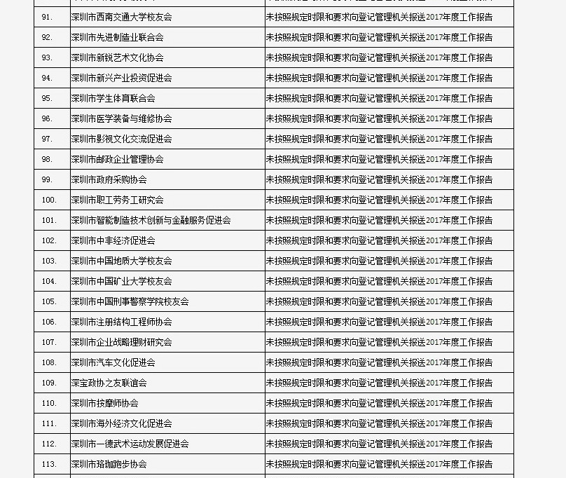 據(jù)深圳市民政局通報,深圳市華中科技大學(xué)校友會和深圳市深圳大學(xué)校友會等121家社會團(tuán)體、深圳市郴州商會等75家行業(yè)協(xié)會商會、企業(yè)家與企業(yè)管理研究院(中國·深圳)等201家民辦非企業(yè)單位、深圳市明園慈善基金會等20家基金會,經(jīng)查“未按照規(guī)定時限和要求向登記管理機(jī)關(guān)報送2017年度工作報告”,違反了《社會組織信用信息管理辦法》《深圳經(jīng)濟(jì)特區(qū)行業(yè)協(xié)會條例》的相關(guān)規(guī)定,被列入活動異常名錄名單。完整版名單已在“深圳民政在線”公布。