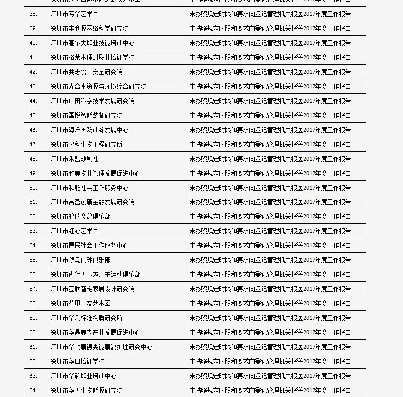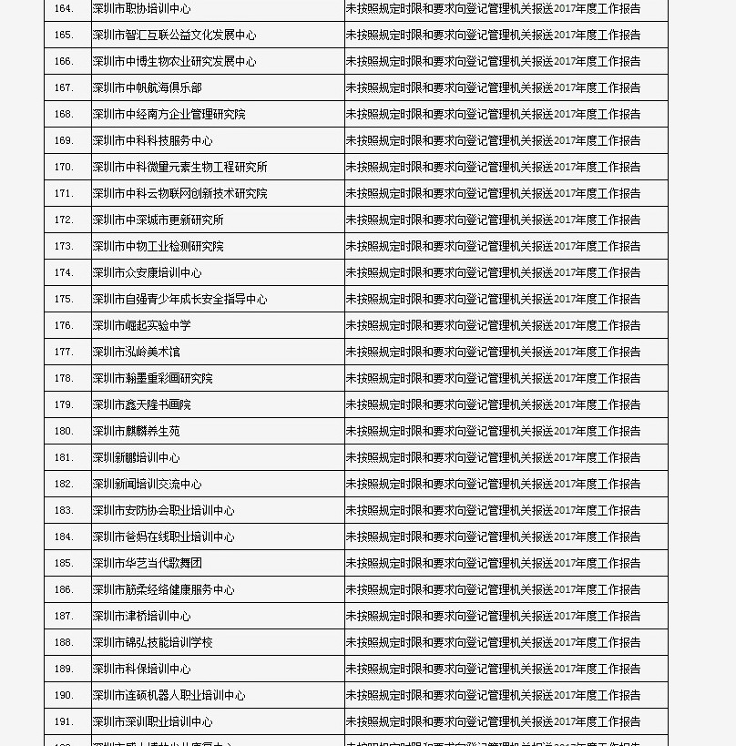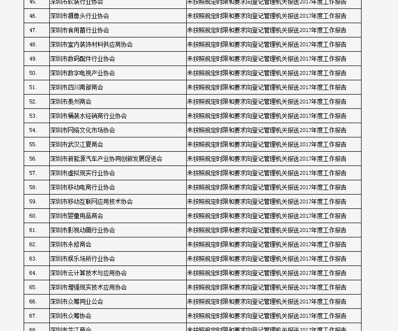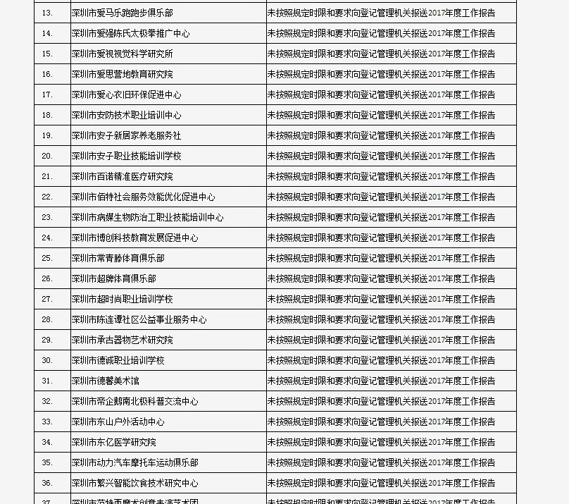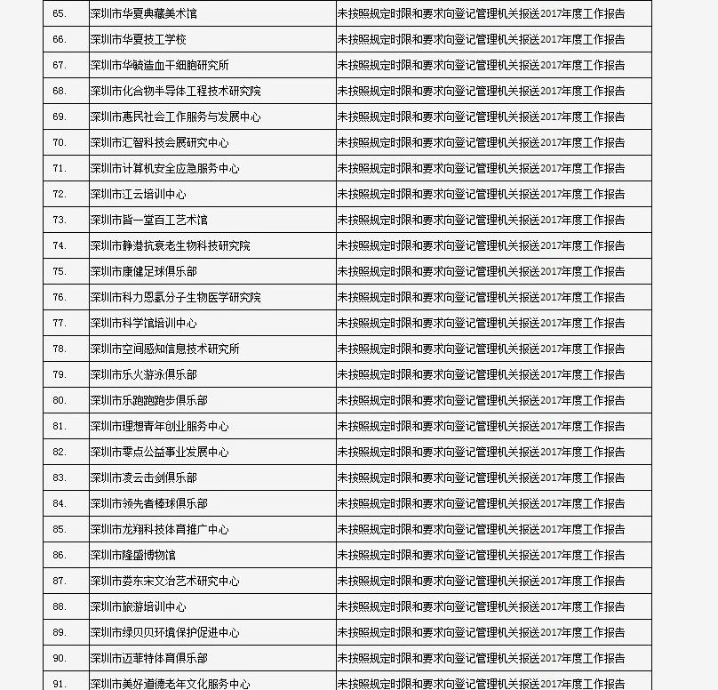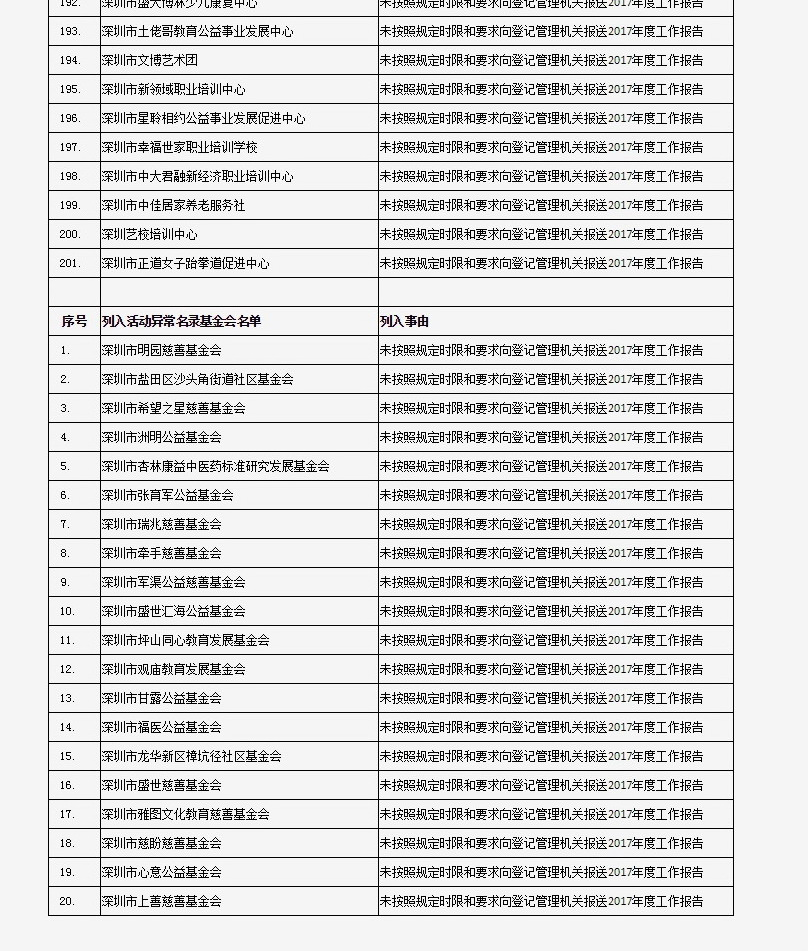 據(jù)深圳市民政局通報,深圳市華中科技大學(xué)校友會和深圳市深圳大學(xué)校友會等121家社會團(tuán)體、深圳市郴州商會等75家行業(yè)協(xié)會商會、企業(yè)家與企業(yè)管理研究院(中國·深圳)等201家民辦非企業(yè)單位、深圳市明園慈善基金會等20家基金會,經(jīng)查“未按照規(guī)定時限和要求向登記管理機(jī)關(guān)報送2017年度工作報告”,違反了《社會組織信用信息管理辦法》《深圳經(jīng)濟(jì)特區(qū)行業(yè)協(xié)會條例》的相關(guān)規(guī)定,被列入活動異常名錄名單。完整版名單已在“深圳民政在線”公布。