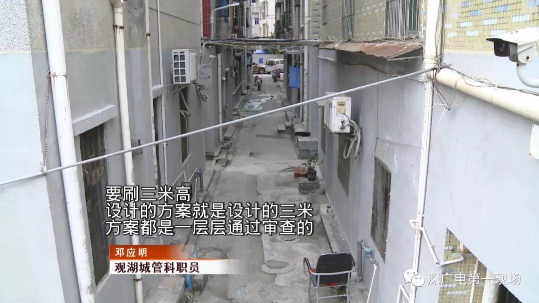 這里是龍華區(qū)觀湖街道辦福樓村里的城中村,這些居民樓的小巷子里,在這兩天來(lái),有不少施工人員正在這里粉刷外墻?,F(xiàn)場(chǎng)施工人員說(shuō),他們只刷房子的底下一層。