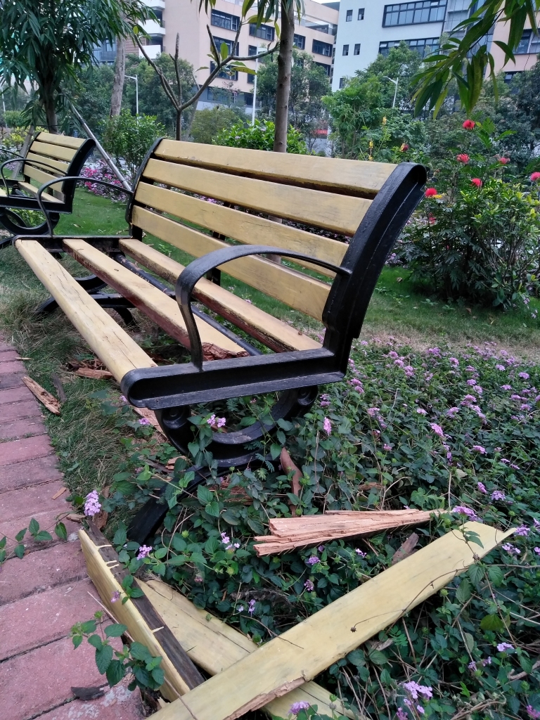 公園內休閑凳被損壞網友“不是隔壁老王”攝
