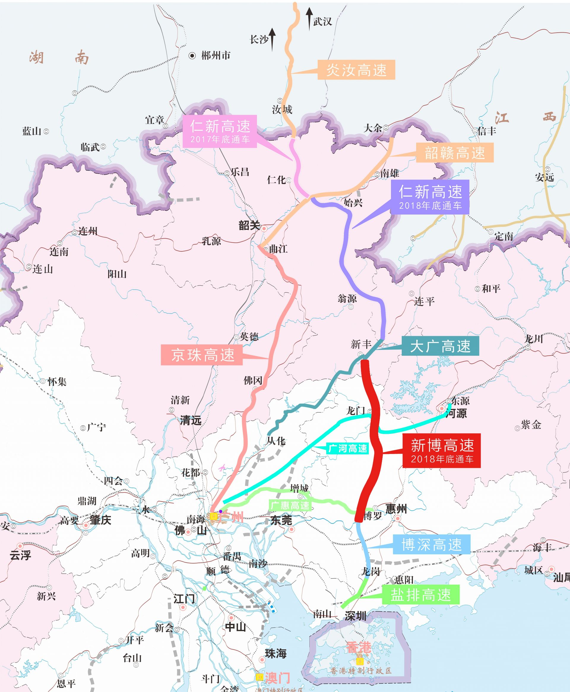 廣東省交通集團工作人員表示,深圳車輛北上,如選擇行經(jīng)博深高速、新博高速、仁新高速,再接湖南炎汝高速進入湖南,車程將從原來6個小時壓縮到4小時以內,比以往節(jié)省約2小時。