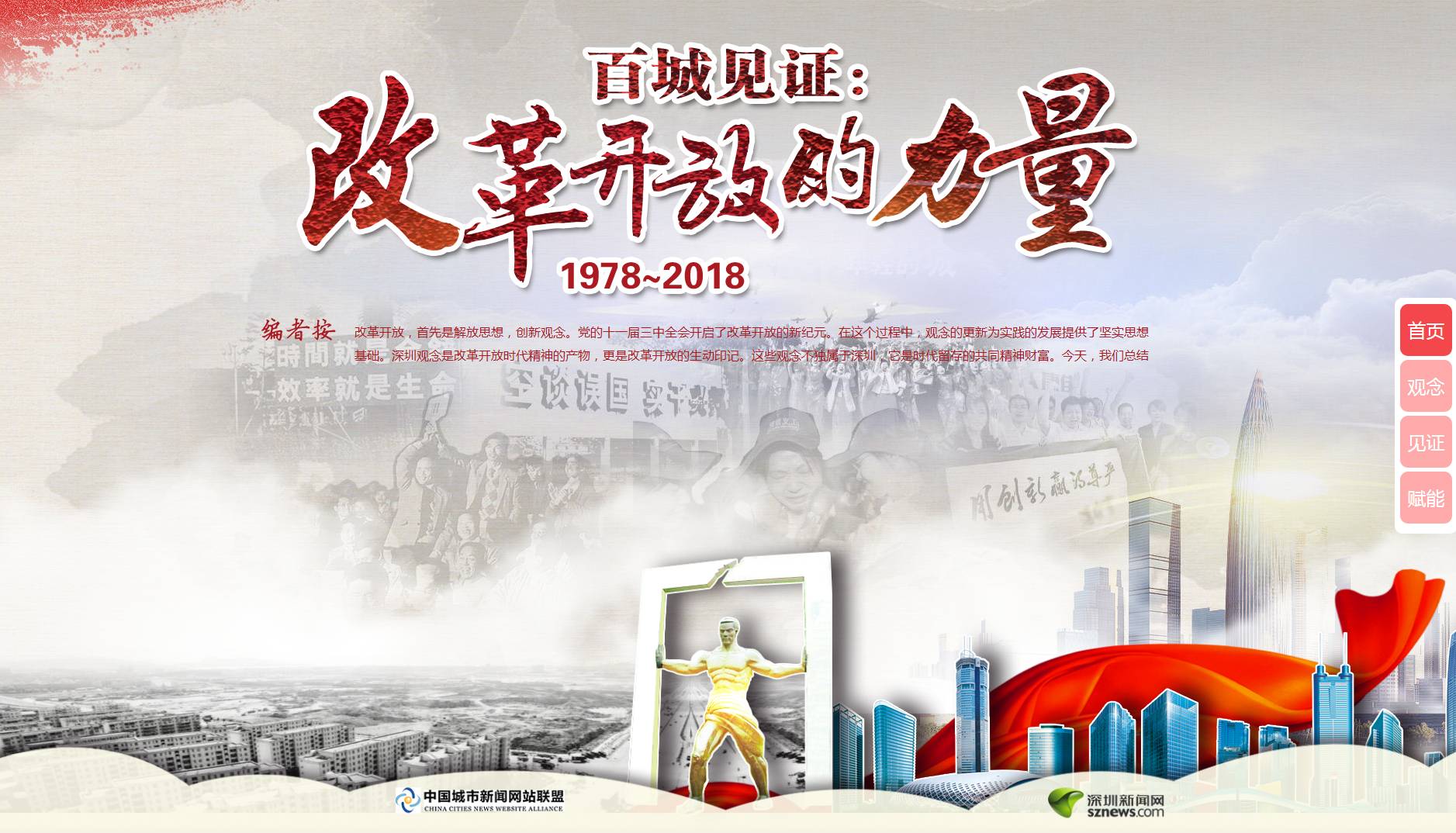 此次活動(dòng)由中國(guó)城市新聞網(wǎng)站聯(lián)盟主辦,深圳新聞網(wǎng)承辦,活動(dòng)在今年10月中國(guó)城市新聞網(wǎng)站聯(lián)盟總編輯聯(lián)席會(huì)上正式啟動(dòng)。專(zhuān)題網(wǎng)頁(yè)采用全新H5技術(shù),用歷史原圖、視頻、音頻和文字交互呈現(xiàn)方式,詮釋改革、實(shí)干、擔(dān)當(dāng)、文明、開(kāi)放、創(chuàng)新等深入民心的改革開(kāi)放觀念,并發(fā)動(dòng)網(wǎng)盟近百家成員單位網(wǎng)站,深入挖掘當(dāng)?shù)爻鞘懈母镩_(kāi)放的生動(dòng)案例和故事,報(bào)道這些代表性觀念對(duì)所在城市發(fā)展的巨大影響,共同描繪改革開(kāi)放40年的生動(dòng)畫(huà)卷。