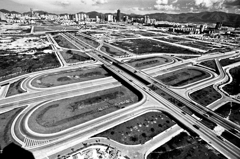 1992年,中心區(qū)“四橋一廣場(chǎng)”進(jìn)入緊張施工,圖為金田立交橋的施工情景,背景是蓮花山。馬樹(shù)華攝