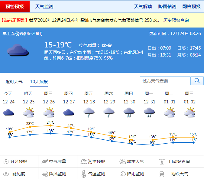 深圳新聞網(wǎng)2018年12月24日訊(記者 施冰冰)記者通過市氣象局了解到,深圳今天陰天間多云,有分散小雨;氣溫17-21℃;東北風(fēng)3-4級(jí),沿海和高地最大陣風(fēng)6-7級(jí);相對(duì)濕度65%-95%。