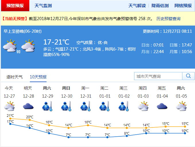 深圳新聞網(wǎng)2018年12月27日訊(記者 施冰冰)記者從市氣象局獲悉,27-28日受寒潮前鋒影響,深圳多云間晴天,風(fēng)力加大,沿海和高地最大陣風(fēng)6-7級(jí),氣溫略降,早晚清涼;29日-元月2日受冷空氣主體影響,氣溫顯著下降,天氣持續(xù)寒冷,最低氣溫7℃左右,并伴有7-9級(jí)陣風(fēng)和間中小雨。寒冷和大風(fēng)天氣將持續(xù)5天左右。