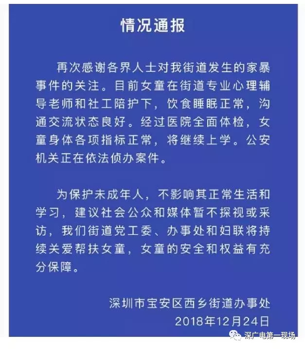 12月24日晚,深圳市寶安區(qū)西鄉(xiāng)街道辦通報表示:目前女童在街道專業(yè)心理輔導(dǎo)老師和社工陪護下,飲食睡眠正常,溝通交流狀態(tài)良好。經(jīng)過醫(yī)院全面體檢,女童身體各項指標正常,將繼續(xù)上學(xué)。