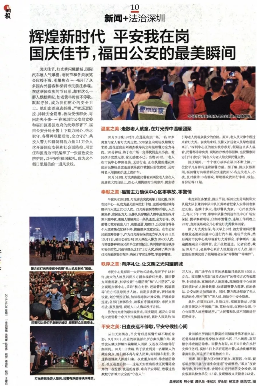 ★★深圳燈光秀表演持續(xù)時(shí)間長,每晚平均人流近20萬人次,安保工作強(qiáng)度大。福田分局參與安保工作的警力堅(jiān)守崗位,維護(hù)現(xiàn)場(chǎng)秩序,在各個(gè)出入口、疏散通道、地鐵口、公交站臺(tái)等人流密集點(diǎn)都能看到他們忙碌的身影。