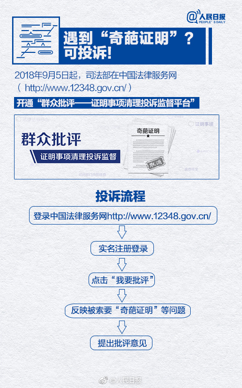 遇到這樣的"奇葩證明"可在司法部開通的網(wǎng)上投訴平臺上進行投訴,實名登錄后即可反映意見,各地方被要求在15天內(nèi)反饋。